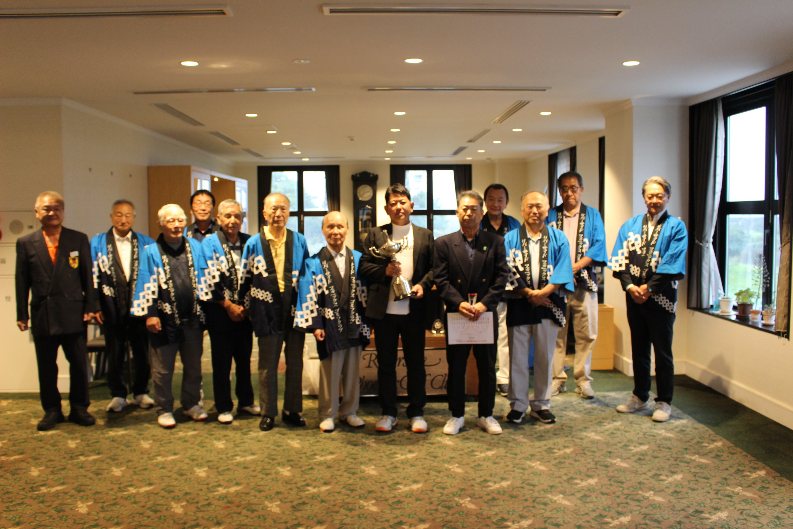 写真左より:今井支配人、細田委員、永吉副委員長(グリーン・コース)、小澤副委員長(競技・ルール)、泉名副委員長(ハンディキャップ委員会)、細野理事(ハンディキャップ委員長)、永嶋理事長、優勝 戸叶選手、次位 矢島選手、秋山理事(エチケット・フェローシップ委員長)、泉名理事(競技・ルール委員長)、細沼理事(グリーン・コース委員長)、永井取締役